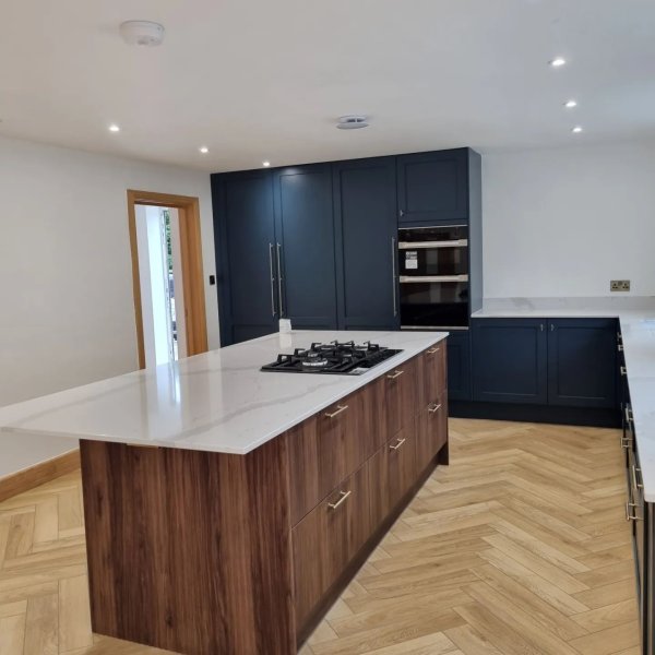 Bridge classic and contemporary aesthetics with these handleless, Chilcomb shaker fronts, which have a striking, marine-blue hue.